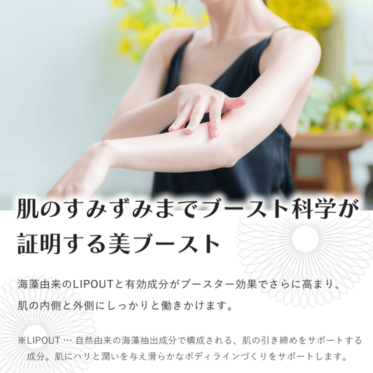 ※LIPOUTとは、自然由来の海藻抽出成分で構成される、肌の引き締めをサポートする成分です。肌にハリと潤いを与え、滑らかなボディラインづくりをサポートします。